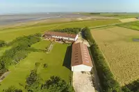 Neuwertig, Bauernhaus, 50 m bis zur Nordsee, Einzellage, mit 300 m² Wohnfläche, 22 Betten in 8 Schlafräumen, 6 x DU + WC für Damen und Herren, Waschmaschine und Trockner, Wohnzimmer mit Fernseher, Küche, 60qm Vortrags- und Aufenthaltsraum, Kaminofen, Küchenausstattung: Geschirrspüler, Haushaltsherd, Mikrowelle, Kühlschrank, Backofen, großer Kühlschrank, 80 m² Terrasse mit Strandkörben, Holzmöbeln, SandspielkisteFreizeit