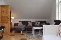 12/16 kleiner Wohnraum im Obergeschoss mit Daybed,Küchenzeile, Kühlschrank, Herd, Geschirrspüler