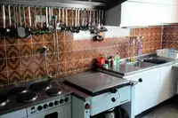 Große Küche:großer Elektro Herd, Großbratpfanne, Groß Back/Brotofen, Töpfe, Mikrowelle, Allesschneider, Kühlschrank und Gefrierschrank, großer Fleischwolf, etc. Speiseaufzug und Kaffemaschine, Elektro-Wassertopf, Toaster, und Geschirrspüler in der Teeküche mit Essgeschirr neben dem Speisesaal.