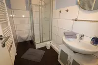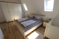 Im Ober- und Dachgeschoss finden Sie eine weitere große Wohnküche, ein Wohnzimmer mit Schlafsofa (2 Personen), ein Duschbad, ein Schlafzimmer (2 Personen und Babybett) und ein Schlafzimmer (3 Personen).