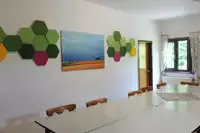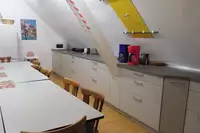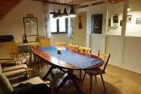 Es gibt eine gut ausgestattete Küche mit Kühlschränken, Kaffeemaschinen, Microwelle, Backofen mit Induktionsherd, Geschirrspüler, Toaster, Waffeleisen und eine Waschmaschine. 2 Aufenthaltsräume, Dusche/Waschraum und 2 WCs, Zentralheizung. Bitte Hüttenschuhe mitbringen.