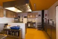 Große Küche mit Mikrowelle, Herd mit 6 Kochplatten (Kochinsel), Kühlschrank etc., Tischen und Stühlen