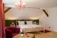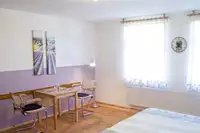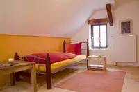 Im Gästehaus warten sieben "blumige " Zimmer mit Du / WC auf große und kleine Gäste ( 15 Betten , bis zu 9 Aufbettungen ) , im Nebengebäude 11 Einzelbetten .Zelte sind zusätzlich erlaubt. Für die Selbstversorgung können Sie eine große, gut ausgestattete Küche nutzen.