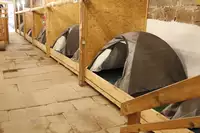 Übernachtet wird in bereits aufgebauten 2-3 Personenzelten auf Isomatten in unserer Campingscheune.