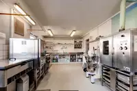 Gut ausgestattete Gewerbeküche mit Kipppfanne, Gewerbespülmaschine, Profi-Rührmaschine, Kartoffelschälmaschine, 2 Gewerbestandöfen mit ca. 20 Blechen, 2 Industrie-Kaffeemaschinen (Filter vor Ort), Gasherd, Kühlraum, Gefrierraum, 4 Haushaltsbratpfannen, 10 Kochtöpfe (verschiedene Größen), Stabmixer, Küchenwaage, Messbecher,