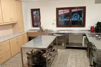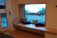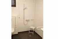Küche, Vorratsraum, Speise- und Aufenthaltsraum mit Kamin, Flur mit Panoramafenstern, Schuhregal und Garderobe, WC mit 2 Kabinen und zwei Waschbecken, 1 barrierefreies Zimmer mit zwei Betten, separates, barrierefreies Bad mit WC