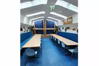 Der Gruppen-/Tagungsraum ist über Oberlichter lichtdurchflutet. Das Sonnendeck (teilweise überdacht) kann zusätzlich genutzt werden, Tische und Bänke sind vorhanden, hier kann auch gegrillt werden.