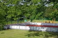 Das attraktiv angelegte, eingefriedete Außengelände bietet:einen Bolzplatz, Tischtennisplatten, Nestschaukel, Rutsche, Klettertipi, Multifunktionsplatz (Streetball, Basketball, Fußball), Koordinationsparcours, Hängematte, Rundkurs für Skater, Sportler, Rollstuhlfahrer, Feuerkorb ein Grünes Klassenzimmer und vieles mehr.