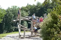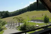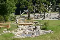 Tischtennis (Outdoor), Kicker (Outdoor), Spielplatz mit Klettergerüst, überhohe Schaukel, naturnaher Wasserspielbereich, Outdoorspiele, heimeliger Lagerfeuer-/Grillplatz, Terrasse, Bolzplatz, naturbelassene Kräuterwiese, Waldgelände mit Rundweg.