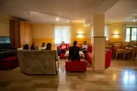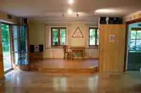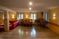 Der große Speisesaal im EG dient auch gleichzeitig als Aufenthaltsraum. Eine gemütliche Sitzecke lädt ein zum Ratschen und Verweilen. Ein paar Gesellschaftsspiele finden sich im Schrank daneben. Zusätzlich gibt Sie noch eine kleine Bühne, die besonders für Impro-Theater oder kleine Aufführungen geeignet ist.