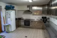 Unsere voll ausgestattete Küche hat 6 Herdeplatten, einen Ofen, einen Kühlschrank, zwei Wärmebecken zum Warmhalten von Speisen, Kaffeemaschinen, Wasserkocher. Geschirr und Besteck ist ausreichend vorhanden. Zusätzlich gibt es eine Industriespülmaschine, welche den Abwasch erheblich beschleunigt. Einen Gefrierschrank finden Sie bei Bedarf in den Kellerräumen. Dort stehen für Notfällen eine Waschmaschine und ein Trockner bereit.
