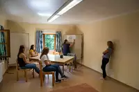 Großer Speisesaal, Küche, 2 Gruppenräume, 1 Meditationsraum, 1 Jugendraum