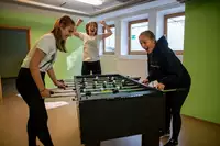 Die Jugendräume sind im Keller. Spaß versprechen ein Billardtisch und ein Kicker. Ein Werkraum mit Arbeitstischen lässt kreativen Ideen freien Lauf. Der Barraum mit Tresen lädt ein zum gemütlichen Abend.