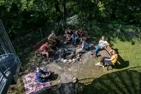 Kleiner Garten mit Lagerfeuerplatz (Brennholz bitte selber mitbringen).Grill bzw. Grillrost muss mitgebracht werden. 3 Gartenbänke stehen zum Entspannen bereit. Fest verbaute Tischtennisplatte (Bälle und Schläger sind mitzubringen)