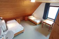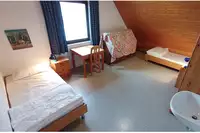 Die zwei Zweibettzimmer und das kleine Bad im Obergeschoss sind für Leitungsteams oder begleitende Lehrer optimal. Das Haus verfügt über drei 8-Bett-Zimmern und ein 6-Bett-Zimmer. Getrennte Duschen und Toiletten für Mädchen befinden sich im 1. Stock und für Jungen im Keller.