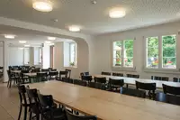 Dusche/WC auf der Etage, alle Zimmer inkl. Waschbecken. Hindernisfreier Pavillon mit Veranda im Garten (2/2). Seminarraum mit Wandtafel, TV und Video, Aufenthaltsraum mit TV und Bibliothek, diverse Gesellschaftsspiele, Internetcorner, WiFi (kostenlos).Freizeit