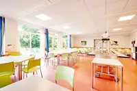 5 Tagesräume, ein Speiseraum, 2- bis 7-Bett-Zimmer mit Dusche/WC, Familienbungalow (15 Betten) für 3 bis 4 Familien, im Neubau 17 Drei- bis Vierbettzimmer mit Terrasse oder Balkon, davon 7 Zimmer mit Verbindungstür. 7 Zimmer sind rollstuhlgerecht.Die Veranstaltungsräume sind mit moderner Tagungstechnik ausgestattet. Mit Handicap mobil - In unserem Haus stehen rollstuhlfahrerfreundliche Zimmer zur Verfügung, doch kann es innerhalb des Hauses sowie auf dem Gelände zu Mobilitätseinschränkungen kommen.