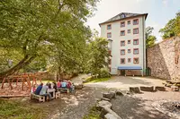 Die als Kulturdenkmal ausgewiesene Burganlage aus dem 11. Jahrhundert wurde im Lauf der Geschichte mehrfach umgebaut und erhielt zuletzt eine moderne Ausstattung unter Einbezug des historischen Ambientes. Sie verfügt über 58 freundlich eingerichtete Zimmer mit 200 Betten, alle mit Dusche und WC. Neben Vierbettzimmern bietet die Freusburg auch Einzel- und Doppelzimmer an. Die Tagesräume, mit individuellem Charakter, bieten Platz für jede Gruppengröße.Ausstattung
