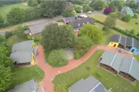 Die Blockhütten sind ausgestattet mit einer Küchenzeile, WC und einer kleinen Veranda. Weitere WCs und Duschen befinden sich in einem zusätzlichen Gebäude. Zum Betreuerhaus gehört eine Teeküche, ein Gemeinschaftsraum und eine große Terrasse. In einem weiteren Gebäude sind ein Kaminzimmer, ein Aufenthalts- und ein Discoraum untergebracht. Alle Gebäude sind von Grünanlagen umgeben.
