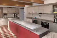 - Küche mit Thekenzeile: 2 Kühlschränke, 1 Gefrierschrank, Geschirrspüler, Backofen, Herd.
