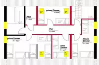 - 15 Betten (Aufbettung bis max.17 Betten) in 4 Schlafräumen von 3-5 Betten,