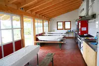 • Geschirrverleih: Geschirr und Besteck für ca. 100 Personen. Töpfe von klein bis sehr groß, Pfannen und Bräter. Kannen, Schöpfer, Reiben, Kartoffelschäler, Brotzeitbrettchen etc. vorhanden. Geschirr und Zubehör bitte vorbestellen, dass die entsprechende Menge für größere Gruppen bereitgestellt werden kann. Geschirrspülen: Überdachter, kleiner Anbau mit großer Spüle und Ablage. Warmes Wasser durchgehend. Für Gäste, welche die Küche nicht mitbenutzen wollen, oder kleinere, separate Gruppen - gibt es 2 doppelflammige Camping-Gasherde zum Kochen.Lage