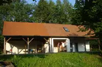 überdachter Kochplatz mit Aufenthaltsraum, Tischtennis. Moderne funktionale Selbstversorgerküche mit Kühlschrank.Freizeit
