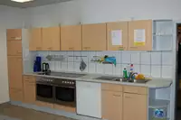 Unterhalb des Zeltplatzgeländes befindet sich das Schorsch Müller Haus. Im Erdgeschoß gibt es eine Küche, ausgestattet mit Geschirr, Besteck, kleinen und mittleren Töpfen, einer Spülmaschiene und zwei Kühlschränken. Im Flur gegenüber sind unsere sanitären Anlagen mit warmen Duschmöglichkeiten für den Zeltplatz untergebracht.Am Ende dieses Flures trennt sie noch eine Tür zu unserem Schmuckstück, dem Pavillon. Mit einem Durchmesser von ca. 15 m bietet sich der zwölfeckige Saal für verschiedene Aktivitäten an. Im ersten Stock befinden sich neben den zwei Schulungs- bzw. Seminarräumen eine kleine Teeküche mit Sitzmöglichkeiten für die Pausen zwischendurch und Toiletten.