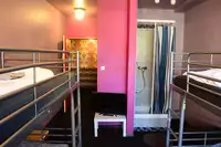 Etagenbetten und Doppelbetten. Einige Zimmer verfügen über eigene Duschen oder eigene Bäder. Es gibt Fernseher und Waschbecken in allen Zimmern.