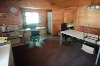 7/12 Zeltlagerleitung (Büro) - mit Tischen, Stühlen und Ablagen eingerichtet, sowie ein Schlafraum mit 2 Betten.