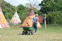Jeweils sieben Personen haben Platz in den geräumigen, kegelförmigen Zelten, die mit einem isolierenden Holzfußboden ausgestattet sind. Unsere 10 Tipis können so bequem Schulklassen und Kitagruppen sowie Familien mehrere Tage inklusive Übernachtung beherbergen.