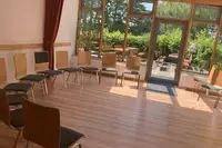 Tischtennisraum, Kaminzimmer, Bistro, Beamer in 4 Gruppenräumen, Flipchart, 12 Kanal Mischpult, Mobile Bühne, Moltons zur RaumDeko LED Spots, Fotokopiergerät, Tischtennis indoor und outdoor, Fußballkicker, Billardtisch, Klavier, Gitarre, Cajon, 85 Autoparkplätze