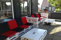 Das Kreativ-Hotel verfügt über eine große Dachterrasse mit Outdoor-Lounge, einem großen Grill und Bierzeltgarnituren.