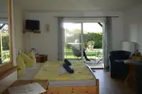 Freuen Sie sich auf unser Gästehaus für 12 Personen, unterteilt in eine Fewo für 4 Personen mit Du/WC, Küche, TV/Terr. und zwei separaten Schlafzimmern sowie ein Appartement für 4 Personen mit Küche/DU/WC/Terr./TV und zwei Doppelzimmer jeweils mit Du/WC/Terr./TV, eines davon im EG.