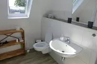 Das Haus ist teilweise rollstuhlgerecht: Die untere Etage kann über eine Rampe mit dem Rollstuhl befahren werden und das untere Bad ist barrierefrei.