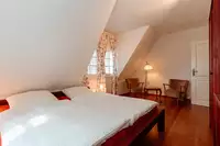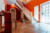 Im Obergeschoss - durch eine große Treppe im Eingangsbereich erreichbar - befinden sich 4 weitere Schlafzimmer mit Doppelbett, in unterschiedlicher Raumgröße, ebenso wie ein Duschbad mit Badewanne.