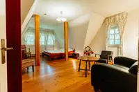 Auf dem Hofgelände gibt es 12 weitere Ferienhäuser /-wohnungen in verschiedenen Größen für 2 bis 12 Personen, gemütlich eingerichtet und mit gut ausgestatteten Küchen. Ein großer Seminarraum für bis zu 30 Personen u.a. mit Beamer, Musikanlage, Bestuhlung und Yoga-Matten (für 10 Personen) befindet sich auf unserem Hofgelände.Auch übernehmen wir die Verpflegung in einem stilvollen Speiseraum bei Seminaren und Veranstaltungen - sprechen Sie uns gerne an.