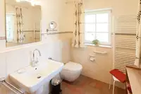 Unser Landhaus liegt etwas abseits von unserem Ferienhof am Kolk, ist durch einen kleinen Feldweg entlang der Pferdeweide vom Hofgelände gut und schnell erreichbar.Ein großzügiger Eingangsbereich empfängt unsere Gäste. Im Erdgeschoss befindet sich ein Schlafzimmer mit Doppelbett, sowie ein Gäste-WC und ein Duschbad (rollstuhlgerecht). Die großzügig geschnittene Wohnküche, mit voll ausgestatteter Landhausküche, großem Esstisch, gemütlicher Sitzlandschaft im offenen Wohnbereich, Ofen und direktem Anschluss an die Sonnenterrasse, bietet Platz für 10 Personen - mit Zustell- oder Kinderbetten auch für bis zu 14 Personen.