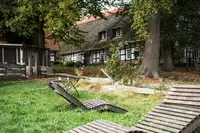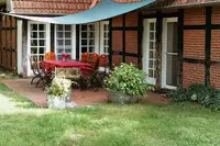 Der Außenbereich am Landhaus besticht durch seinen verwunschenen Garten, die große Sonnenterrasse, verschiedene Sitz- und Liegemöglichkeiten, sowie eine Feuerstelle und Grillmöglichkeiten direkt am Haus. Auf der großen Rasenfläche kann getobt und gespielt oder in der Baumschaukel sitzend ein Buch gelesen und die Natur genossen werden. Auch Hunde sind auf Anfrage und Aufpreis erlaubt.