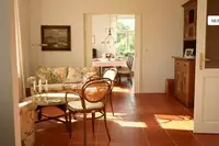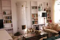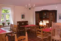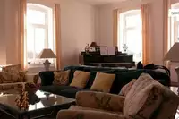 Im dreiteiligen 80 m² großen Wohnraum mit Flügel, Bibliothek und schwedischem Jugendstil-Kaminofen vergisst man schnell den Alltag. An der Tafel im Esszimmer können 14 Personen Platz nehmen, sie ist durch das Mittelzimmer mit 10 weiteren Plätzen verlängerbar.
