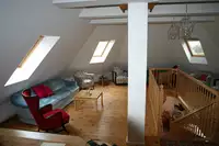 Der Aufenthaltsraum im DG Bereich mit dem spitzgiebeligen hohen Dach, mit Holzboden und 10 Veluxfenstern (auch zum Verdunkeln) und Klavier animiert sowohl zu vielfältiger kreativer Aktivität als auch zum geselligen Beisammensein.