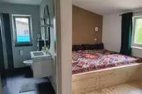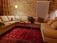 EG Gartenwohnung 120 m² mit Wohnbereich 70 m² Küchenblock, Esstisch, Sofalandschaft, Kaminofen, 2 Schlafzimmern 1 Wannen- Duschbad.