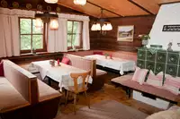 Große Wohnstube mit Kachelofen und gemütlichen Sitzecken