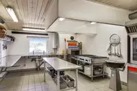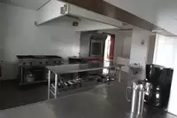 2 Kaffeemaschinen, 1 Wasserkocher, Spülmaschine, Gasherd mit 4 großen Flammen und einer Warmhalteplatte, 2 Kipppfannen, 1 Kombi Dampf- und Backofen, 2 Servierwagen, 2 große Kühlschränke, 1 Tiefkühltruhe