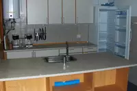 Ausgestattet für ca. 30 Personen, mit Kühlschrank, Gefrierschrank, Elektroherd mit 4 Platten, Backofen, Kaffeemaschine, Wasserkocher, Mixer, sowie einem Depot mit Kühltruhe