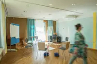 Seminarräume: Für Tagungen steht ein 80 m² großer Seminarraum mit Holzfußboden zur Verfügung, der zusammen mit dem Essraum für Veranstaltungen, Feiern auf 120 m² erweiterbar ist. Er ist sowohl für Körper- und Bewegungsarbeit geeignet, als auch mit Tischen, Bestuhlung und Medienausstattung zu nutzen.Ein weiterer Raum bietet die Möglichkeit zur Kleingruppenarbeit. Die Medienausstattung (Musikanlage, Flip-Chart, Metaplan, Beamer) sowie Klavier und Gesellschaftsspiele sorgen für gute Arbeitsbedingungen.