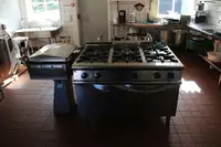 Profi-/Gewerbeküche mit Kartoffelschälmaschine, Gemüseschälmaschine, 3 Handmixer, Waage, Kipppfanne, Toaster, Industrie-Rührmaschine, prof. Kaffeemaschine, Kühlschränke, Gefrierschrank, Kipp-Bratpfanne, Kombiofen mit Dampf, Warmluft und ein konventioneller 6- flammiger Gasherd, einer Brot- Aufschnittmaschine sowie Geschirr und Besteck für 120 Personen. In der Spülküche gibt es eine Waschmaschine und eine Spülmaschine, im Depot gibt es einen Freezer.