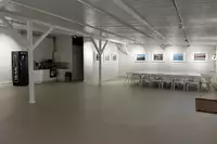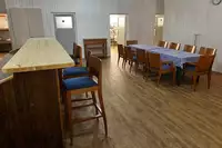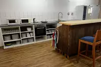 Im Aufenthaltsraum (zwischen den Zimmern und den Toiletten) befindet sich eine einfache Küchenzeile mit einem Backofen, mehreren Kochplatten, drei großen Kühlschränken und einem Tresen. Hier ist zur Zeit Platz für ca. 20 Personen.