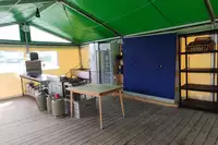 Holzfussboden, Strom, Licht, Gasherd mit Backofen, große Gastrospüle, zwei große Kühlschränke, einfache Grund-Küchenausstattung inkl. Geschirr und Besteck, Bierzeltgarnituren, Vor dem Küchenzelt stehen ca. 80 m² Außenfläche mit Grill und Feuerstelle zur alleinigen Nutzung bereit.