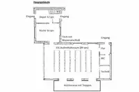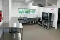 Einen Großküchen-E-Herd (4) mit Backofen, 1 Gefriertruhe in separatem Raum, 2 große Kühlschränke, davon einer für Gemüse, 1 große Spülmaschine, 1 Kaffeemaschine sowie Geschirr für 60 Personen.